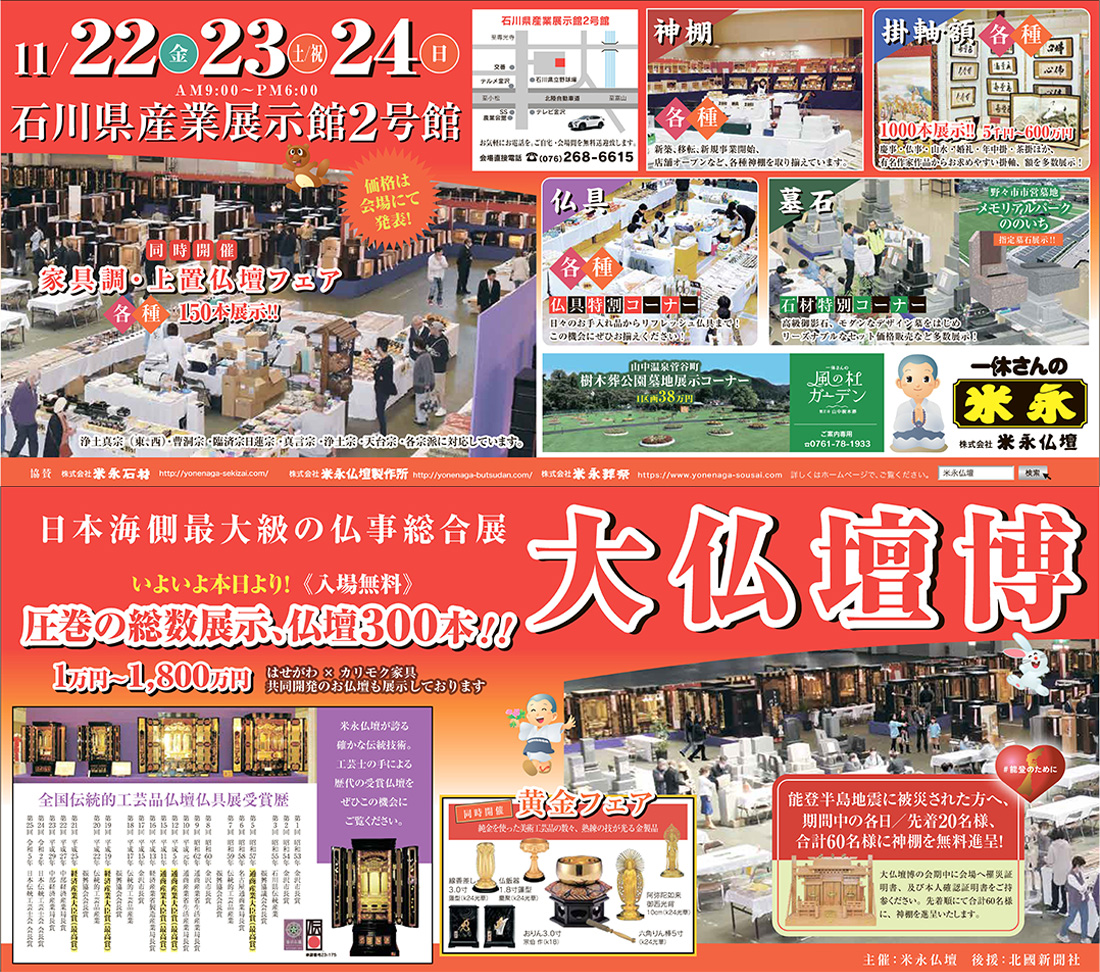 2024年11月22日(金)~24日(日)の3日間、「大仏壇博」を石川県産業展示館2号館で開催します。